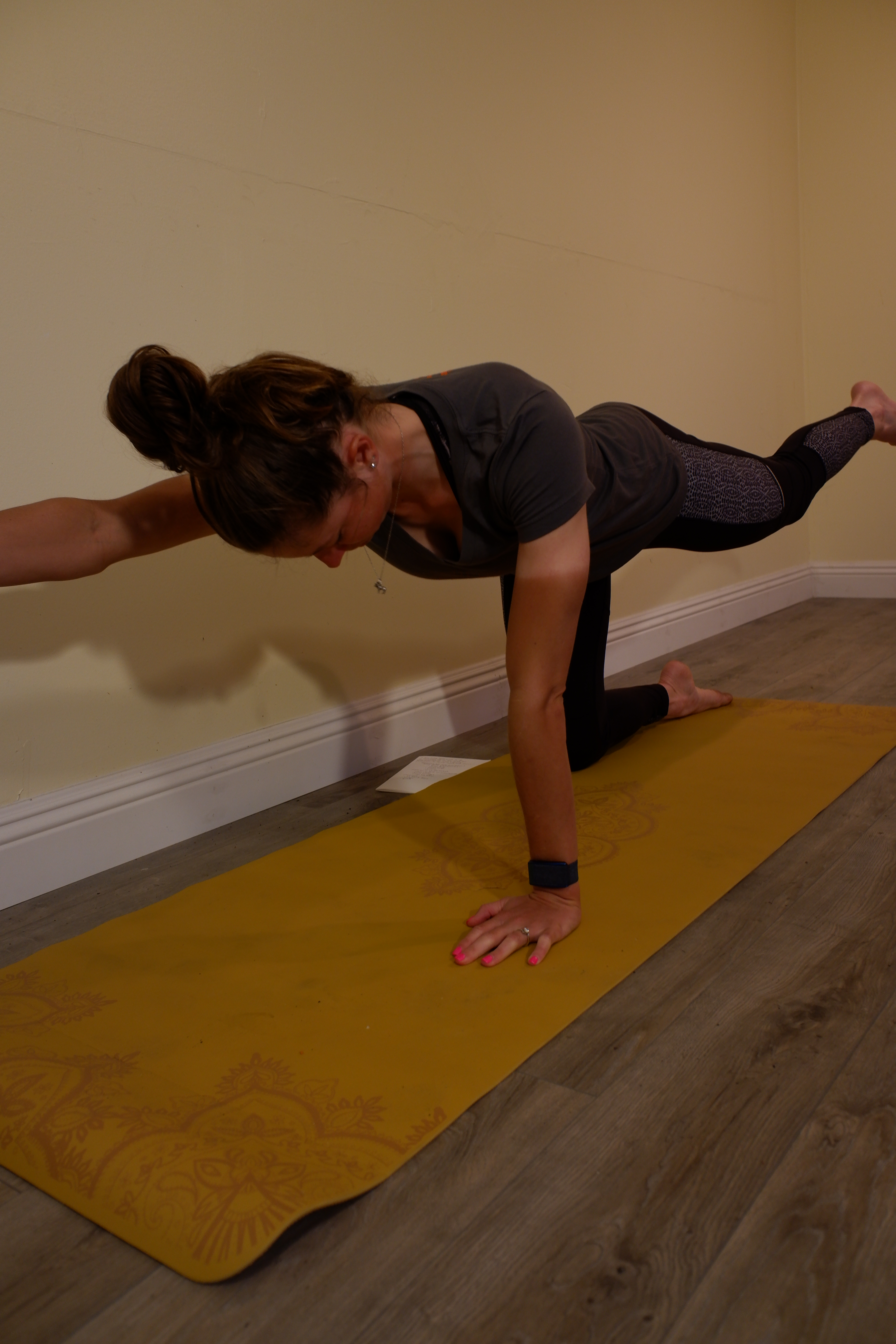Begin on your hands and knees in a quadruped position. Focus on having your hands directly below your shoulders and your knees below your hips. Think about having a flat back. Now, extend your right arm and left leg straight out until they are parallel with the floor. Maintain a flat spine, level hips, and pull your belly button inward. Return to the starting position and do it again with the other arm and leg.